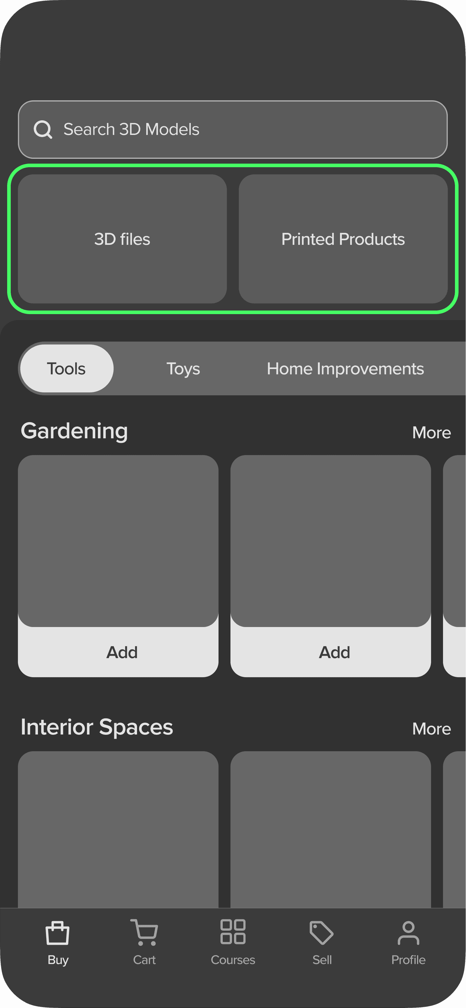 By swapping the categories with search bar, users are able select types of 3D products and search within the filtered types.